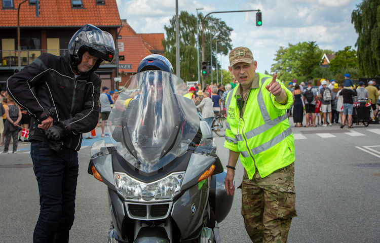 Som om verdens største cykelløb ikke var en stor nok opgave, så er lørdag den 2. juli, hvor etapen starter i Roskilde, også kulminationen på dette års Roskilde Festival. En af Europas største musikfestivaler. Her er Hjemmeværnsdistrikt Midt og Vestsjælland også til stede med soldater, der står for trafikregulering.