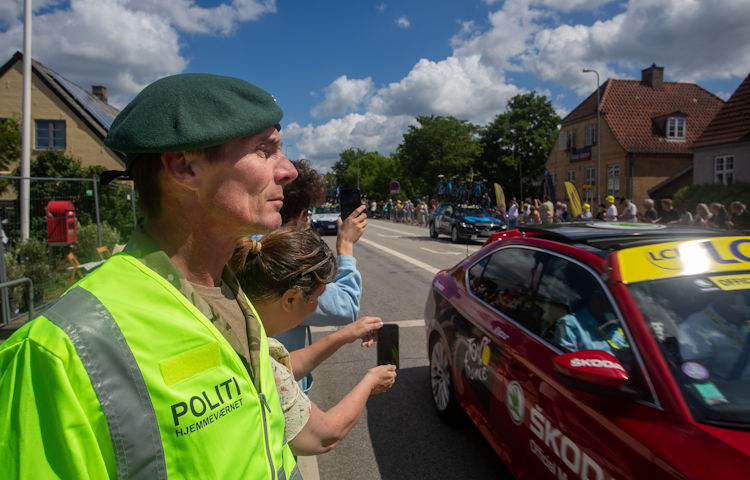 Anden etape begyndte i Roskilde. Her var det Hjemmeværnsdistrikt Midt- og Vestsjælland, der sammen med politiet og andre myndigheder, skulle sørge for, at cykelløb og anden trafik forløb planmæssigt. Oberstløjtnant Peter Serup, der er chef for hjemmeværnsdistriktet, har været med i planlægningen af den store opgave i et års tid. En opgave, der konstant ændrede sig.