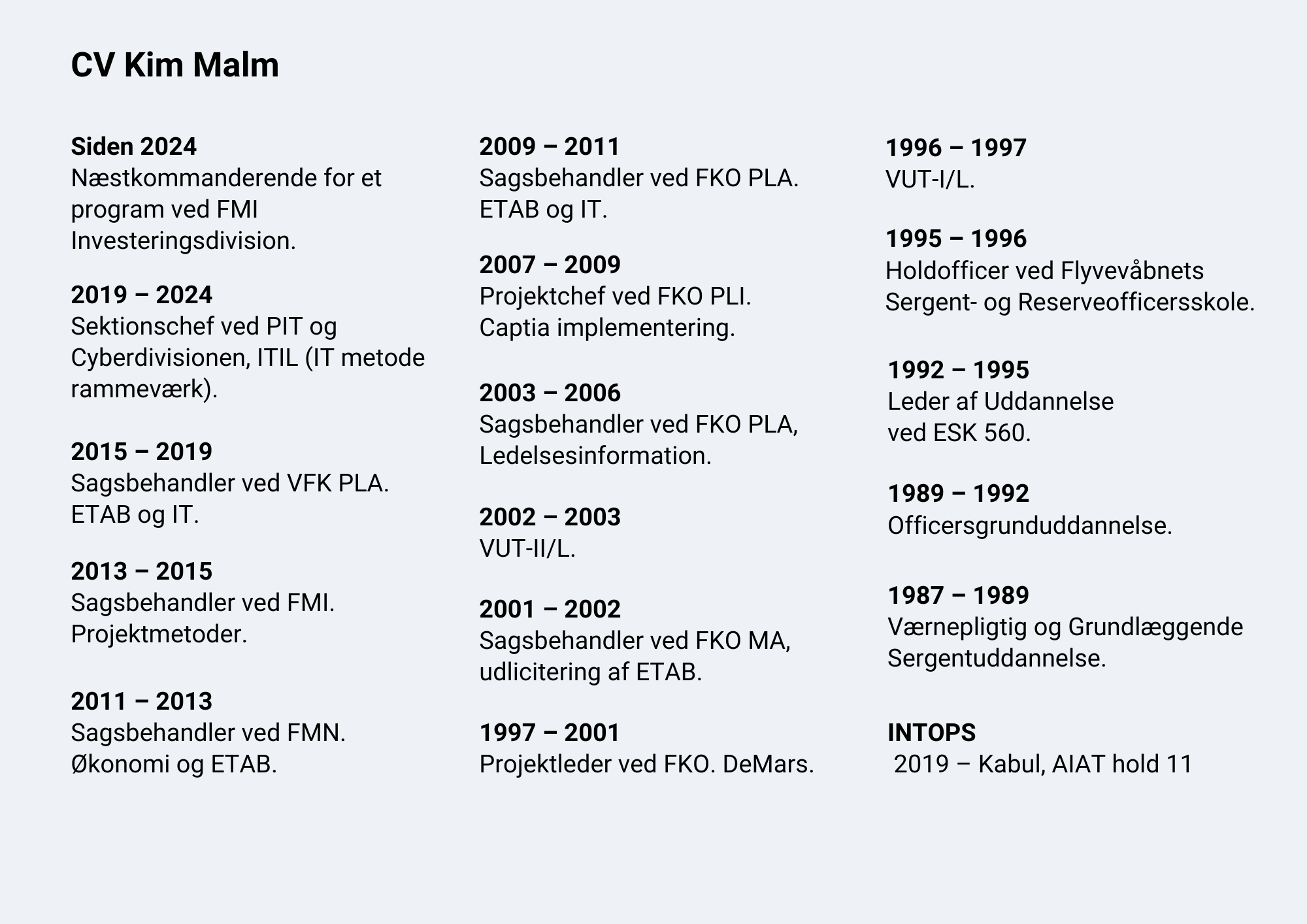 Major Kim Malm, 57 år. HB-medlem og stedfortrædende værnsformand Flyvevåbnet. Sektionschef ved FMI.